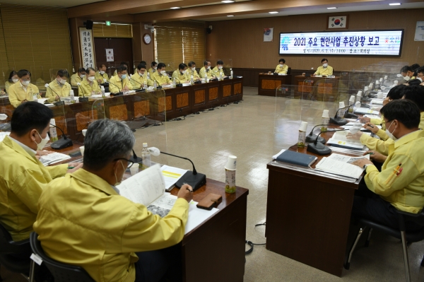 군은 지난 2일 군청 회의실에서 김석환 군수와 길영식 부군수를 비롯한 각 국장·직속기관장, 담당관·과장·사업소장이 참석한 가운데 2021년 주요 현안사업 추진상황 보고회를 개최했다.