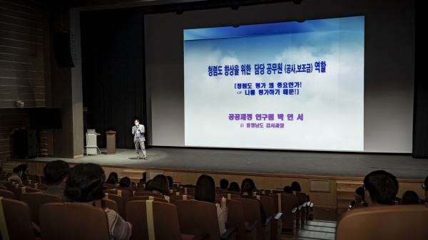 이번 교육은 공공재정연구원 박인서 전무가 교육을 맡아 군 청렴도 분석과 문제점 도출, 청렴도 향상전략, 공무원의 역할과 자세에 관해 설명했다.