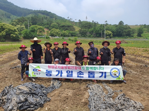 자율방범연합대는 지난 13일 대원 20여명이 참여한 가운데 청양읍의 한 농가를 방문해 마늘 수확을 도왔다.