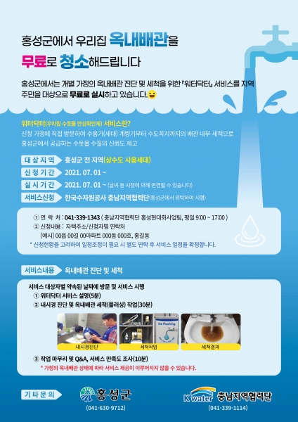 [충청뉴스큐] 홍성군은 안전한 수돗물 공급을 위해 옥내배관 진단 및 세척을 위한‘워터닥터’서비스를 연말까지 무료로 실시한다고 15일 밝혔다.