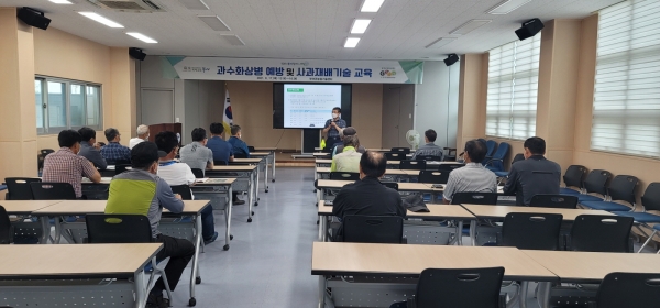 이날 교육은 국립원예특작과학원 사과연구소 권헌중 연구관이 최근 과수 농가에 문제되고 있는 과수화상병 예방을 위한 과원관리와 일반사항, 사과나무 수세관리를 중점으로 강의가 진행됐다.