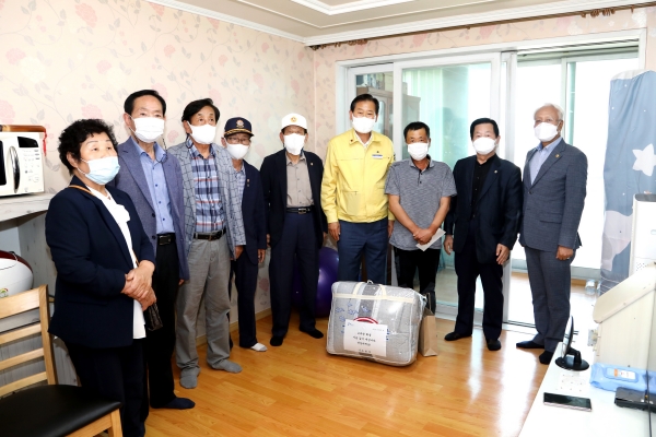21일 오후 김재종 옥천군수를 비롯한 7개 보훈단체장, 옥천읍장 10명은 상이군경회 장철환 님과 전몰군경유족회 박희배 님의 집을 방문해 더운 여름 시원하게 지낼 수 있도록 여름이불세트 등을 전달했다.