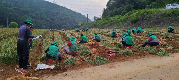 일주일간 군 새마을회는 20여 농가, 1ha 규모의 마늘밭에서 마늘 수확과 운반 작업 등으로 구슬땀을 흘렸다.