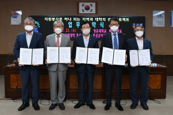 [충청뉴스큐] 홍성군은 23일 자원봉사를 통한 나눔과 온정으로 지역과 대학이 하나 되어 더불어 사는 사회를 만들어 나가기 위해 지역 3개 대학, 봉사단체와 손을 맞잡았다.