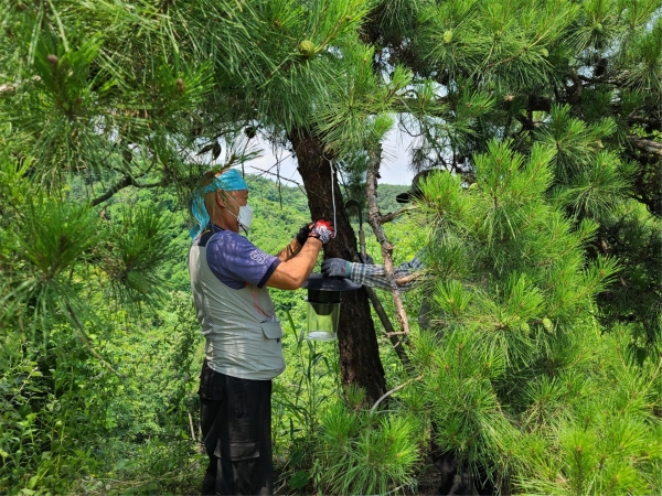 페로몬트랩은 암컷의 페로몬을 분비해 수컷 성충을 포집하고 매미나방 번식을 방해하는 장치이다.