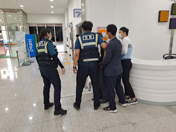 민원담당직원, 청원경찰, 논산경찰서 논산지구대 등 유관기관 관계자를 포함한 30여명은 상황별 민원응대 매뉴얼에 따라 민원인 중재 시도 현장 녹음 및 촬영 비상벨 호출 피해 직원과 방문 민원인 대피 가해 민원인 제압 경찰 인계 등 실제 상황을 가정한 훈련을 실시했다.