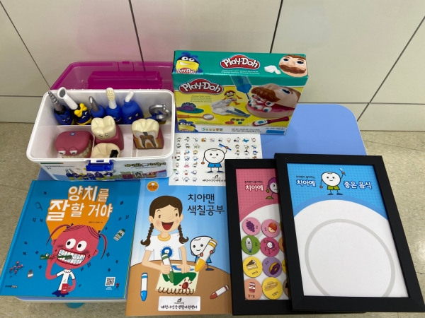 구강보건교육 대여물품은 총 5종이며 동화와 QR코드를 이용한 양치송 뮤직비디오와 치아에 좋은 음식·치아에 나쁜 음식 인식 개선을 위한 치아맨 자석놀이, 치아모형 및 치과기구를 이용한 치과치료 놀이, 클레이를 이용한 치과놀이 체험도구 등이다.