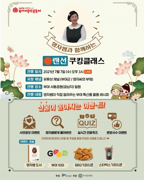 [충청뉴스큐] 부여군은 제19회 부여서동연꽃축제의 일환으로 오는 7월 7일 오후 3시에 ‘영자쌤과 함께하는 랜선 쿠킹클래스’ 프로그램을 운영한다고 밝혔다.