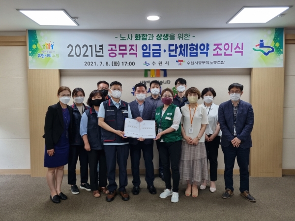 양측은 6일 시청 귀빈실에서 김선재 수원시 행정지원과장, 김규동 수원시공무직노동조합 위원장, 윤숙자 전국민주연합노동조합 수원시 지부장 등이 참석한 가운데 조인식을 하고 2021년도 임금·단체 협약서에 서명했다.