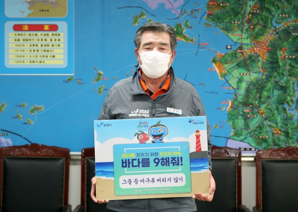 김 시장은 김호빈 한국중부발전 사장의 지목을 받아 이번 캠페인에 참여하게 됐으며 9가지 실천행동 가운데 ‘그물 등 어구류 버리지 않기’를 선정했다.