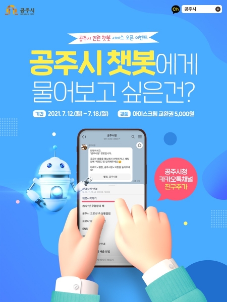 공주시 카카오톡 챗봇 이용화면을 캡처해 인증하고 챗봇에게 더 묻고 싶은 질문 등에 대답하면 추첨을 통해 100명에게 모바일 기프티콘을 선물한다.