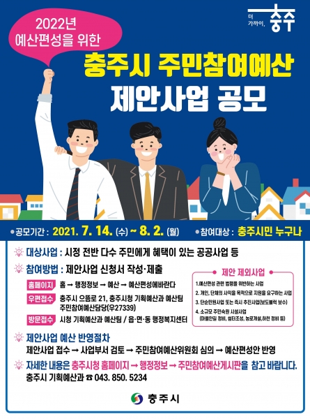 [충청뉴스큐] 충주시는 2022년도 예산편성을 위한 주민참여예산 사업 공모를 14일부터 오는 8월 2일까지 20일간 실시한다.