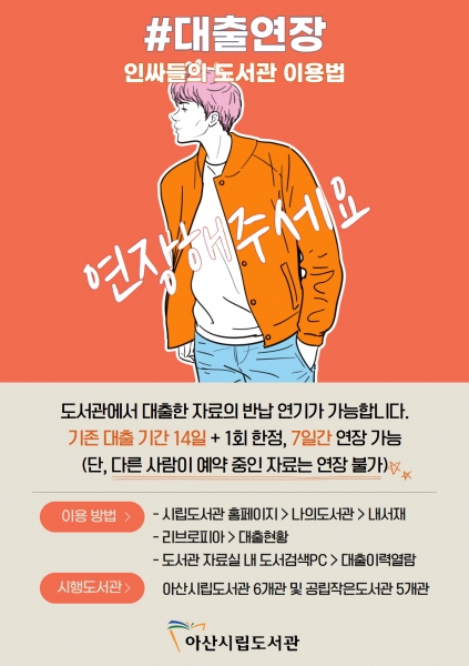 [충청뉴스큐] 아산시립도서관이 15일부터 지역주민의 독서활동 지원과 도서관 서비스 이용 편의를 위해 도서관 홈페이지와 전용앱을 통한 도서 대출기간 연장 서비스를 시행한다.