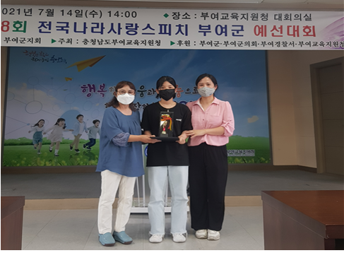 [충청뉴스큐] 부여군시설관리공단은 지난 14일 청소년문화의집 방과후아카데미 소속 청소년들이 한국자유총연맹 부여군지회 주관 전국나라사랑스피치대회 부여군 예선대회에서 수상했다고 밝혔다.