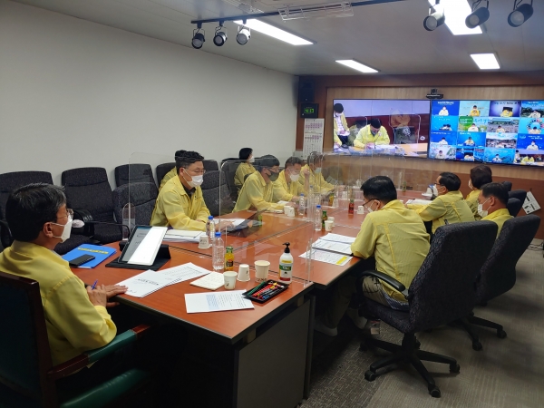 중앙재난안전대책본부, 충청남도재난안전대책본부와 영상회의에 이어 청양군재난안전대책본부 회의를 진행한 김 군수는 19일부터 2주간 사회적 거리두기 2단계 중 5인 이상 사적 모임을 금지하는 조정 방안을 협의했다.