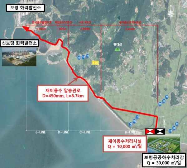 보령하수처리수 재이용사업은 한국중부발전 공업용수 취수처를 보령댐에서 보령하수처리장으로 일부 대체해 하천으로 방류되는 하수처리수를 정수 처리를 통한 수질 향상 후 발전소로 공급하는 사업이다.