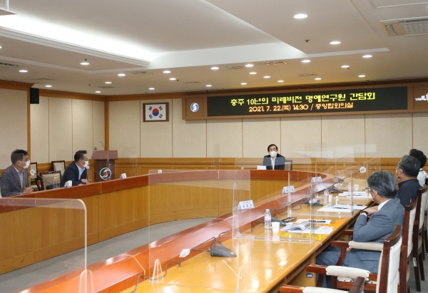 이날 간담회에서는 충북연구원 원광희 지역발전연구센터장 등 7명의 명예연구원이 각자의 전공분 야에서 활동하며 생각했던 정책 조언, 충주시에 접목할 수 있는 미래산업 등 다양한 의견들을 제시하며 열띤 토론을 이어갔다.