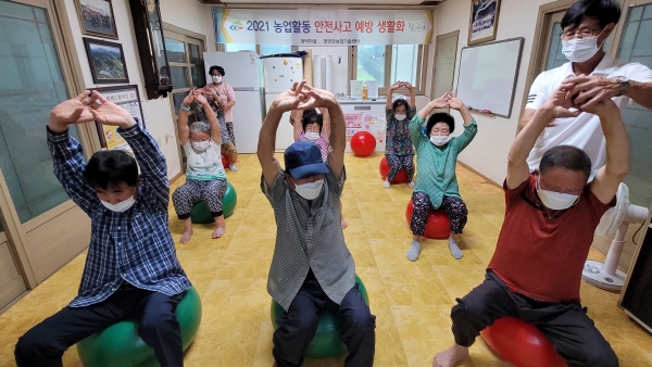 주민들은 스위스볼을 활용한 근골격계 강화 운동과 농기계 작업의 위험성 인지 활동에 참여하면서 농촌 생활 중 건강을 유지하는 비결을 배웠다.