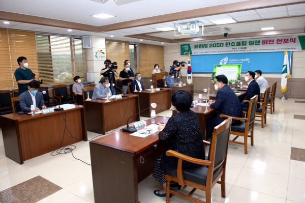 [충청뉴스큐] 제천시는 지난 26일 시청 박달재실에서 제천시의회, 시민단체가 참여한 가운데 2050년 탄소중립 실현을 위한 ‘제천시 2050년 탄소중립 비전 선포식’을 개최했다.