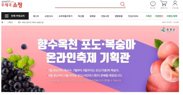 특히 지난 7월 10일부터 우체국쇼핑몰 기획관에서 운영 중인‘향수옥천 포도·복숭아 온라인축제’는 오픈한지 얼마 지나지 않아 조회수가 36만회를 기록하며 전국의 소비자들에게 인기를 끌고 있다.