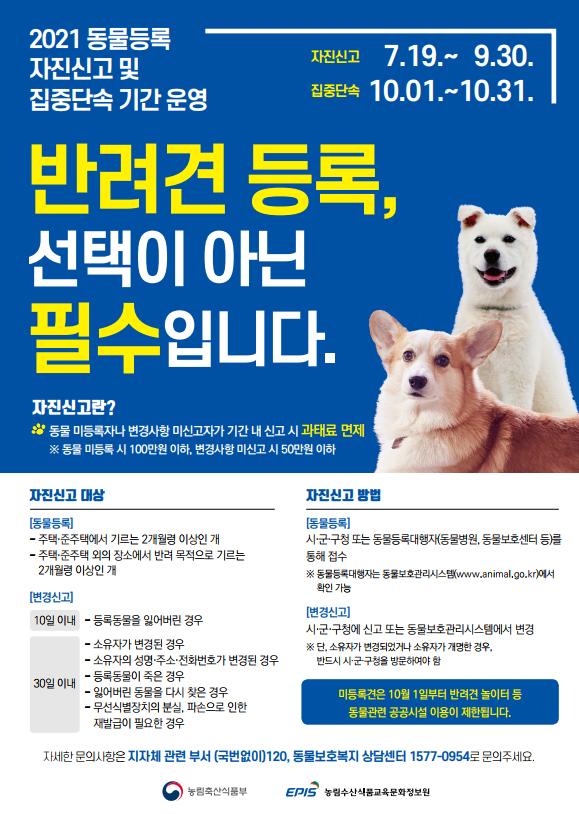 자진신고를 하면 미등록에 따른 과태료가 면제되며 미등록 시에는 10월 1일부터 반려견 놀이터 등 동물 관련 공공시설의 이용이 제한된다.