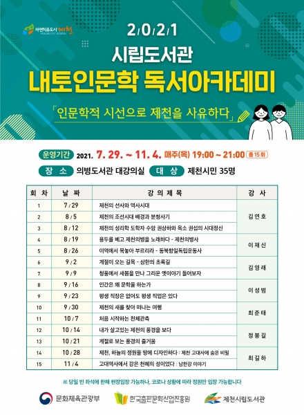 [충청뉴스큐] 제천시립도서관는 오는 29일 부터 ‘내토인문학 독서아카데미’를 개강한다.
