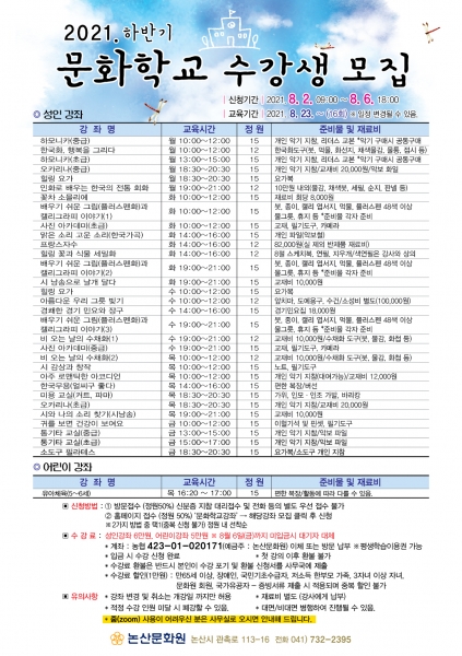 [충청뉴스큐] 논산문화원은 시민들에게 능동적으로 문화 활동에 참여하고 평생 학습의 기회를 제공하며 건전한 여가 활동을 위해 2021년 하반기 문화학교 수강생을 모집한다.