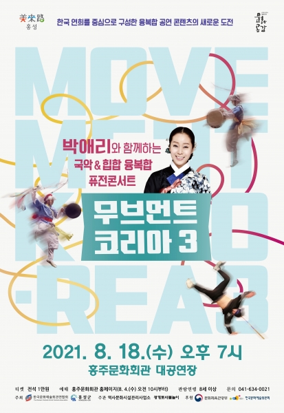 [충청뉴스큐] 홍성군은 여름방학과 휴가철을 맞아 부모님과 자녀들이 함께 즐길 수 있는 공연인 ‘박애리와 함께 하는 국악&힙합 융·복합 퓨전콘서트 ‘무브먼트코리아 3’’를 8월 18일 오후 7시에 개최한다.