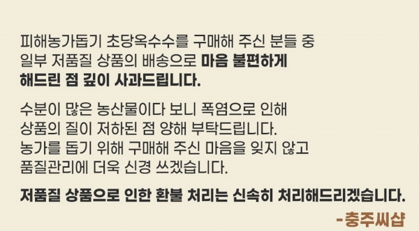 [충청뉴스큐] 충주시는 농민들을 돕기 위해 상품성이 낮아진 초당 옥수수를 긴급하게 판매하는 과정에서 발생한 일부 품질 저하 상품에 대해 환불 및 교한 등 적극 대처에 나서기로 했다.
