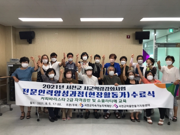 [충청뉴스큐] 서천군 지속가능지역재단 마을만들기지원센터는 지난 5일 서천경제진흥통합센터 2층 교육실에서 2021년 서천군 시군역량강화사업의 하나로 추진하고 있는 ‘마을맞춤형 전문 인력 양성과정-바리스타 2급, 쇼콜라티에’ 수료식을 가졌다.