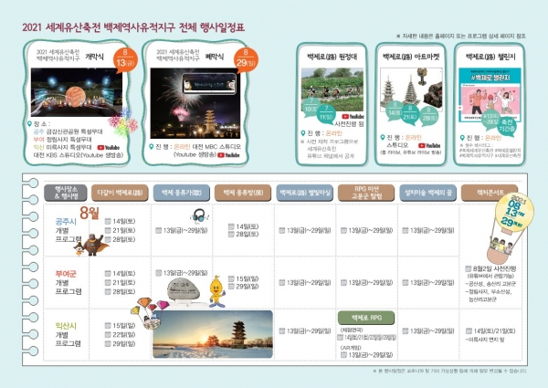 오는 13일에 부여 정림사지 등 3개 장소에서 동시에 개최되는 개막식은 코로나19 확산 차단을 위해 4원 생중계 비대면 방식으로 진행된다.