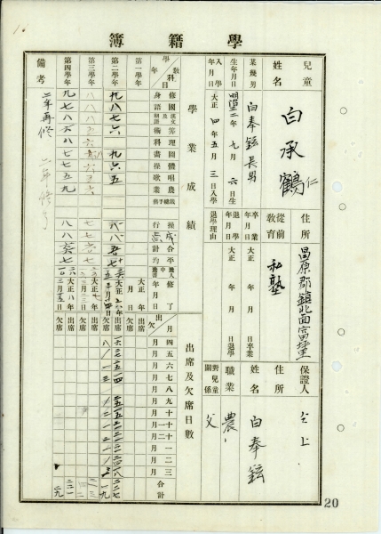학교를 입학하기 전에는 글방에서 수학했다는 기록이 있으며 2학년을 재수했다는 기록도 비고란에 쓰여있다.