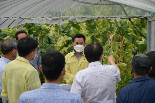 이날 현장에서 박정현 군수는 농업인들의 애로사항을 청취하고 피해 최소화를 위한 방향 제시와 피해 대책을 강구할 것을 지시했다.