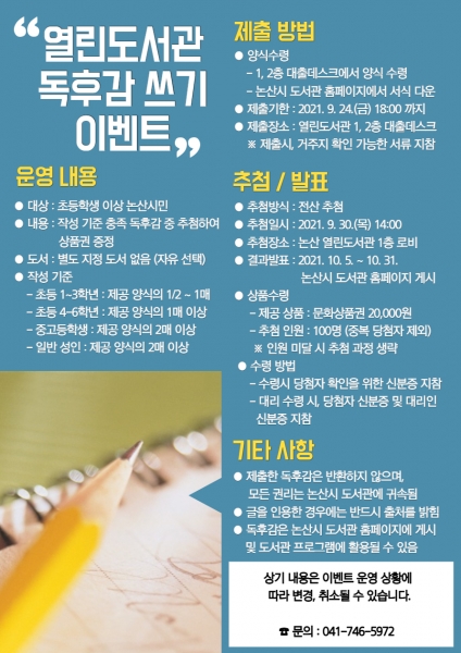[충청뉴스큐] 논산시는 오는 9월 24일까지 독후감쓰기 이벤트를 실시하고 독서와 이를 글쓰기로 표현하는 재미를 시민과 함께 나눈다.