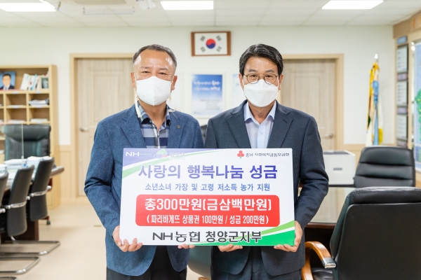 [충청뉴스큐] NH농협 청양군지부가 지난 18일 청양군을 방문, 소년소녀가장과 고령 저소득 농가를 지원하기 위해 파리바게트 상품권과 성금 200만원을 전달했다.