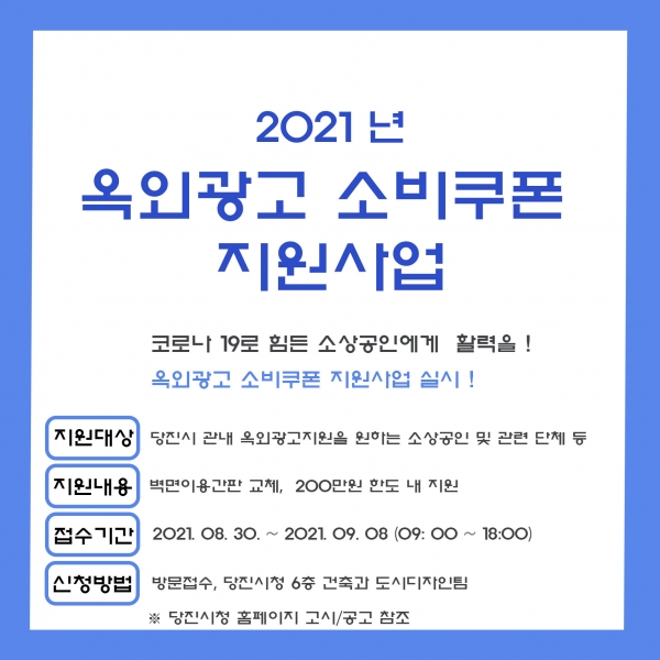 [충청뉴스큐] 당진시가 이번 달 30일부터 소상공인 등을 대상으로 간판 교체 및 설치 비용을 지원하는 '옥외광고 소비쿠폰 지원 사업'을 추진한다고 19일 밝혔다.