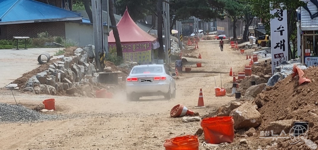 홍성군이 발주해 진행되고 있는 용봉산 진입도로 확포장공사가 관리가 안 돼 이곳을 출입하는 관광객과 주민들이 불편을 호소하고 있다.