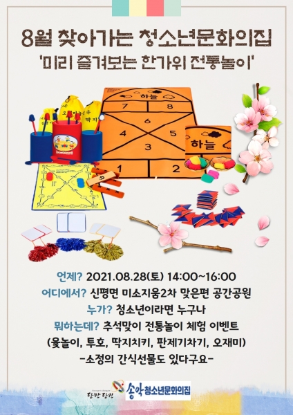 “8월 찾아가는 송악청소년문화의집”은 신평면 미소지움 2차 아파트 맞은편 공원에서 오는 28일 토요일 오후 2시부터 4시까지 진행될 예정으로 프로그램 내용으로는 9월 한가위를 맞이해 미리 즐겨보는 전통놀이를 체험해볼 수 있도록 진행할 계획이라고 전했다.