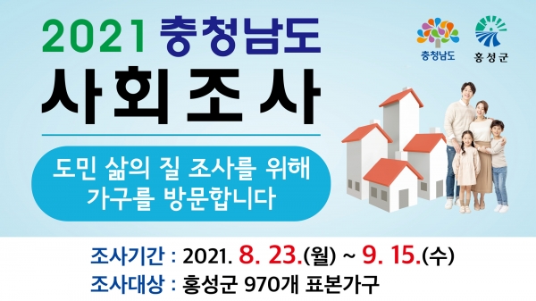 조사대상은 2021년 8월 23일 기준 홍성군에 거주하고 만15세 이상 가구주 및 가구원 중 표본으로 선정된 970가구로 조사항목은 건강, 가구와 가족, 교육, 노동 등 충남 공통 항목 50개와 홍성군 특성항목 6개 등 총56개 항목으로 구성됐다.