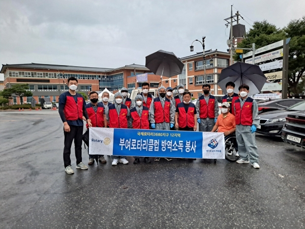 최근 부여군 외국인 근로자발 집단감염으로 지역주민들의 불안이 커지고 있는 가운데, 부여로타리클럽 회원들은 휴일을 반납하고 감염 확산 방지를 위해 방역활동을 준비했다.
