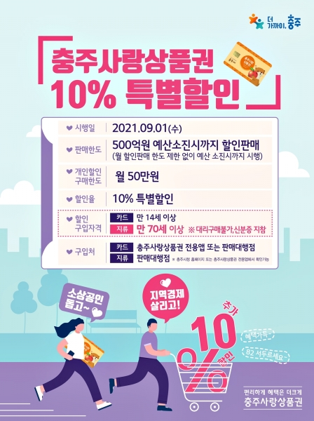 25일 시에 따르면 기존 매월 100억원 규모로 할인 판매했던 충주사랑상품권을 9월부터는 월 한도 제한 없이 500억원 소진 시까지 10% 특별할인을 추진한다.