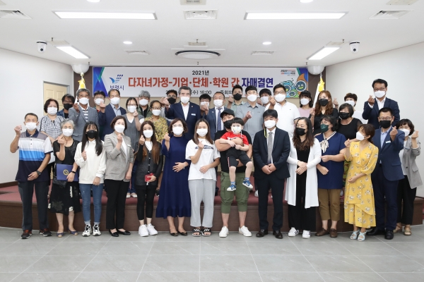 시는 지난 25일 시청 중회의실에서 김동일 시장과 다자녀가정, 기업 및 단체, 학원 관계자 등이 참석한 가운데 다자녀가정 지원을 위한 자매결연식을 개최했다.