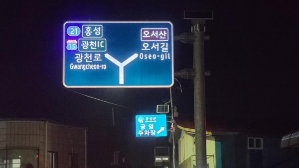 [충청뉴스큐] 홍성군이 교통사고 예방과 안전한 도로환경을 조성하기 위해 광천오거리, 광천터미널 등 10개소의 일반도로표지판을 발광형 LED도로표지판으로 교체했다고 26일 밝혔다.
