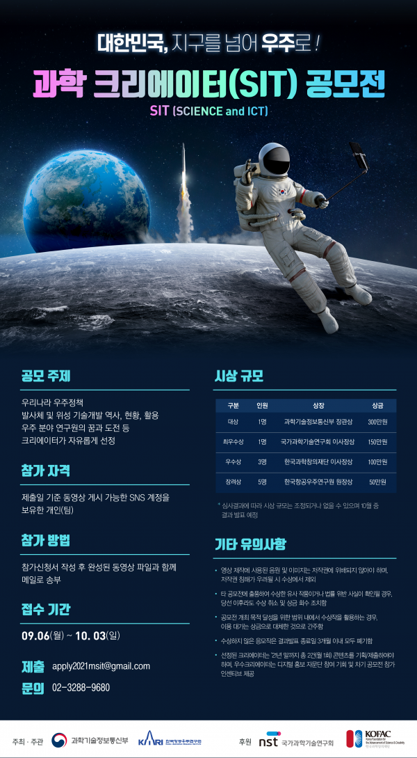 [충청뉴스큐] 과학기술정보통신부와 한국항공우주연구원은 우리나라의 과학기술 및 정보통신 정책에 대한 다양한 영상 콘텐츠를 제작하기 위해 ‘과학 크리에이터 발굴 공모전’을 개최한다고 밝혔다.