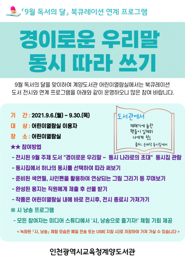 [충청뉴스큐] 인천광역시교육청계양도서관에서는 9월 독서의 달을 맞아 ‘경이로운 우리말~ 동시 나라로의 초대’라는 북큐레이션 및 연계 프로그램을 6일부터 30일까지 운영한다.