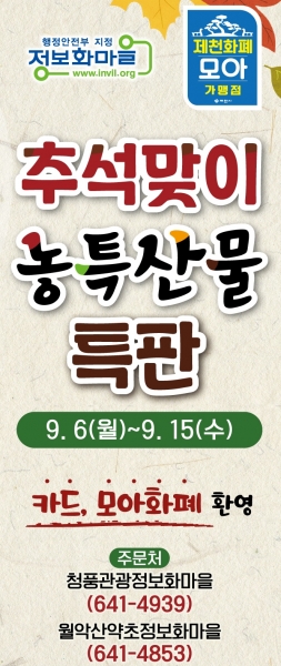 청풍관광정보화마을 박명민 위원장과 월악산약초정보화마을 강태용 위원장은 “이번 추석맞이 판매 행사에 많은 관심을 당부 드리며 제천화폐를 활용해 보다 더 저렴하게 정보화마을의 우수한 농·특산물 구매를 추천한다”고 전했다.