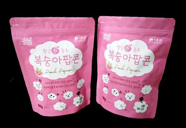 기존에 개발된‘사과 팝콘’, ‘고추 팝콘’, ‘우유 팝콘’에 이어 새롭게 선보이는 신제품 ‘복숭아 팝콘’은 충주시농업기술센터의 연구개발 지원을 받아 개발된 가공식품이다.