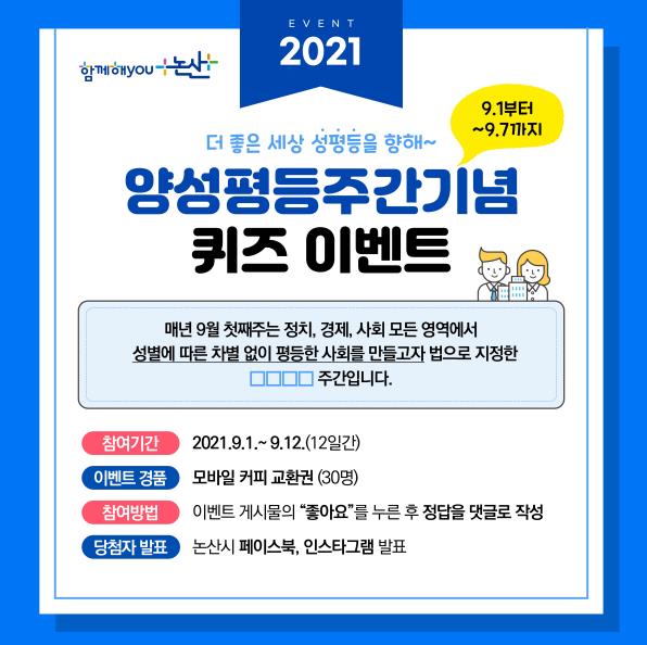 시는 “더 좋은 세상, 성평등을 향해”라는 슬로건 아래 양성평등주간의 의미를 되새기고 시의 양성평등 정책을 널리 알리고자 카드뉴스를 제작, 홈페이지 및 공식 SNS에 게시했으며 퀴즈 이벤트도 함께 실시한다.