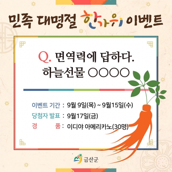 [충청뉴스큐] 금산군은 민족 최대명절 한가위를 맞아 금산군청 카카오톡 채널을 추가하면 음료 기프티콘을 증정하는 퀴즈 이벤트를 진행한다고 9일 밝혔다.
