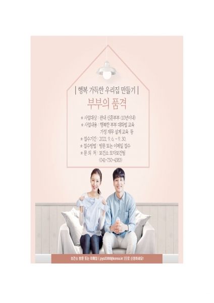 [충청뉴스큐] 금산군보건소는 오는 9월 30일까지 ‘부부의 품격’ 슬기로운 가정생활 교육 신청을 받는다고 밝혔다.
